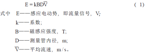 電磁流量計(jì)的基本原理是法拉第電磁感應(yīng)定律,即導(dǎo)體在磁場中切割磁力線運(yùn)動時在其兩端產(chǎn)生感應(yīng)電動勢。如圖1所示,導(dǎo)電性液體在垂直于磁場的非磁性測量管內(nèi)流動,與流動垂直的方向上產(chǎn)生與流量成比例的感應(yīng)電勢, 電動勢的方向按弗來明右手規(guī)則,其值如下式: