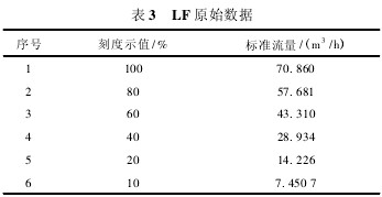 玻璃管轉(zhuǎn)子流量計(jì)具有結(jié)構(gòu)簡單、工作可靠、線性刻度、讀數(shù)直觀等特點(diǎn),屬于變面積式流量計(jì)的一種,在工業(yè)計(jì)量中應(yīng)用廣泛。一般出廠時對玻璃管粗細(xì)均勻程度要求較高,但其粗糙的刻線使得其在使用中誤差非常大。由于玻璃管自身是錐體的,所以無法均勻分割刻線以達(dá)到與標(biāo)準(zhǔn)流量相接近的目的。為了達(dá)到預(yù)期使用目標(biāo),本著方便快捷、經(jīng)濟(jì)合理的原則,本文以LZB-50和LF百分比型兩種流量計(jì)為例,采用鐘罩式氣體流量標(biāo)準(zhǔn)裝置,介紹如何把刻度示值無限接近地修正到標(biāo)準(zhǔn)流量。 1.相關(guān)概念 刻度示值:玻璃管或坐標(biāo)紙上標(biāo)刻的讀數(shù),單位為m3/h,有時也用百分比。 標(biāo)準(zhǔn)流量:在101325Pa,20℃狀態(tài)下的流量,單位為m3/h。 引用誤差:(刻度示值-標(biāo)準(zhǔn)流量)/量程上限×100%。 2.LZB-50型流量計(jì) (1)把轉(zhuǎn)子流量計(jì)按玻璃管上的刻度示值做一遍檢定,得到如表1所示數(shù)據(jù),從中可以看出刻度示值為“100”和“80”時的引用誤差非常大,已經(jīng)無法正常使用(JJG257—2007《浮子流量計(jì)檢定規(guī)程》中規(guī)定引用誤差最大為5%)。 (2)用坐標(biāo)紙測量一下玻璃管上刻度示值“100”與“80”之間有多少小格(1小格=1mm),測得“100”與“80”之間有66mm。 (3)把刻度示值“100”對應(yīng)的標(biāo)準(zhǔn)流量105.080m3/h減去刻度示值“80”對應(yīng)的標(biāo)準(zhǔn)流量85.764m3/h,計(jì)算出“100”與”80”之間相差的標(biāo)準(zhǔn)流量。即 105.080-85.764=19.316m3/h (4)計(jì)算出刻度示值“100”與“80”之間每毫米對應(yīng)多少m3/h。即 19.316/66=0.29266m3/h (5)以標(biāo)準(zhǔn)流量105.08m3/h為基準(zhǔn),找出標(biāo)準(zhǔn)流量為100m3/h時對應(yīng)到玻璃管上的位置。即 105.08-100=5.08m3/h 5.08/0.29266=17.4mm (6)由(5)中的兩個式子可以得出,標(biāo)準(zhǔn)流量為100m3/h和105.080m3/h時在玻璃管上的位置相差17.4mm。在坐標(biāo)紙上找一起始刻線,并在玻璃管左側(cè)與“100”橫豎對齊并固定好,從坐標(biāo)紙的起始刻線處向下移動17.4mm,該位置就是標(biāo)準(zhǔn)流量為100m3/h時的位置,在此處畫一橫線作標(biāo)記,記數(shù)為100。以后把浮子升到該位置就可較為正確地得到100m3/h的標(biāo)準(zhǔn)流量。 7)上述步驟只得到刻度示值“100”的修正,同理可以得出80與60,60與40,40與20相差的距離,通過向下調(diào)整而得到所需修正值。如果我們認(rèn)為某點(diǎn)滿足使用不用修正,那么就可以對照玻璃管上的刻線直接畫過來。 (8)修正完所有刻度示值后,按照坐標(biāo)紙上的刻度示值重新檢定。得到如表2所示數(shù)據(jù),從中可看出刻度示值為“100”與“80”時的引用誤差已變?yōu)?.28%,0.39%,明顯優(yōu)于修正前。 3.LF百分比型流量計(jì) 按玻璃管上的百分比刻度做其對應(yīng)的標(biāo)準(zhǔn)流量,如表3所示。從表3可看出,假如需要60m3/h、50m3/h、40m3/h、30m3/h的標(biāo)準(zhǔn)流量時,我們是無法較為正確把浮子調(diào)到玻璃管上其對應(yīng)的位置的,因此需要通過下列步驟得到我們想要的結(jié)果。 (1)根據(jù)上述數(shù)據(jù)用Excel等軟件繪制LF曲線圖轉(zhuǎn)換成線性公式得出標(biāo)準(zhǔn)流量;也可用下列公式y(tǒng)=ax+b(a為直線斜率,b為直線截距)求出標(biāo)準(zhǔn)流量。 (2)經(jīng)計(jì)算得a=0.7104,b=0.3728,即y=0.7104x+0.3728。我們已經(jīng)知道刻度示值“10”對應(yīng)的標(biāo)準(zhǔn)流量為7.4507m3/h,那么只要以此為基準(zhǔn),向上找出60m3/h、50m3/h、40m3/h、30m3/h與7.4507m3/h之間的距離即可。 (3)由(2)中式子得出x=(y-0.3728)/0.7104,把所求的流量點(diǎn)流量(60m3/h,50m3/h,40m3/h,30m3/h)依次設(shè)為y值,得x值分別為83.9mm,69.8mm,55.7mm,41.7mm。 (4)在坐標(biāo)紙上找一起始位置,并在玻璃管刻線左或右側(cè)與刻度示值“10”橫豎對齊并固定好,用鉛筆做一標(biāo)記,記數(shù)為10。因?yàn)槲覀儾恍枰疫@個流量點(diǎn),所以全部標(biāo)完后要擦除該記數(shù)。 (5)以記數(shù)為10的起始刻線為基準(zhǔn),向上到達(dá)41.7,55.7,69.8,83.9mm處時分別做標(biāo)記,畫一橫線,這些橫線標(biāo)記即為所求流量點(diǎn),記數(shù)為30m3/h,40m3/h,50m3/h,60m3/h。 4結(jié)論 利用價格低廉的坐標(biāo)紙?jiān)诓AЧ苌蠘?biāo)注刻線,克服了玻璃管流量計(jì)自身出廠時的缺陷,更加有效地提高了流量計(jì)的精度,為工業(yè)計(jì)量節(jié)約了采買新流量計(jì)的成本。