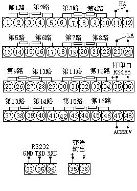 報警輸出: ⑴1-64通道統(tǒng)一上下限報警,繼電器輸出觸點容量 AC220V/3A